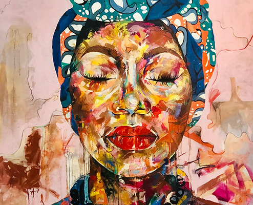Mwamba Chikwemba is a self-taught Zambian visual artist. Her creative process focuses on women’s identity in a place where social norms prevail and female roles are strictly defined. Mwamba wants her portrait paintings to be seen as a collective image of African women who have power, courage and wisdom to follow their own goals.