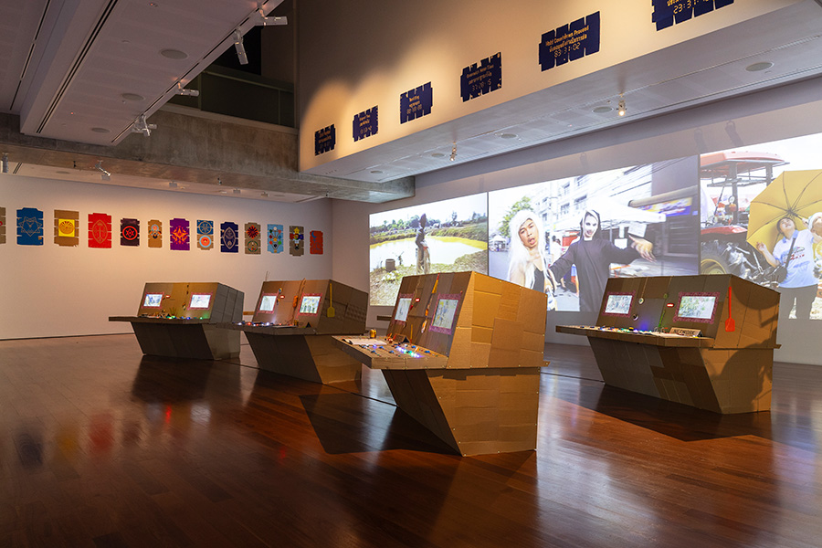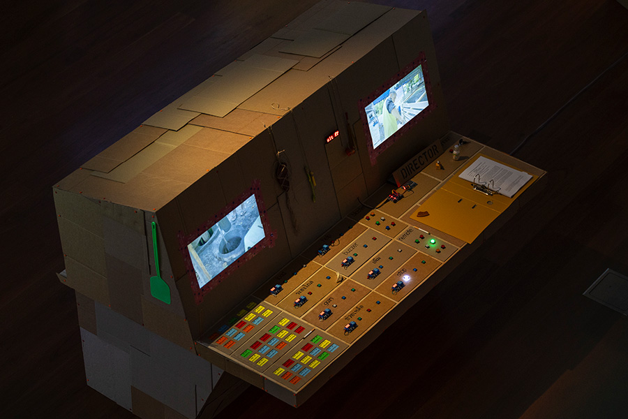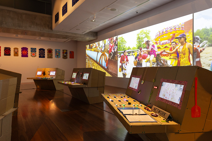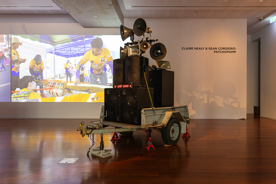 Image: Claire Healy and Sean Cordeiro, Psychopomp, 2025, installation view, Samstag Museum of Art. Photograph by Sia Duff.