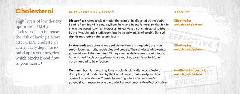 “In our study, we reviewed the most commonly used nutraceuticals claiming to treat the most prevalent health conditions, and found that the most consistent outcomes related to reductions in cholesterol levels, in blood pressure, and improvements in the control of blood glucose levels,” she says. “We also saw that disease activity was reduced in rheumatoid arthritis and osteoarthritis.