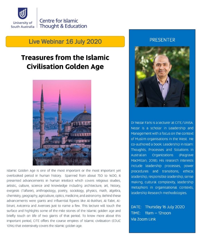 Islamic Golden Age is one of the most important or the most important yet overlooked period in human history. Spanned from about 750 to 1600, it presented advancements in human intellect which covers religious studies, artistic, culture, science and knowledge including architecture, art, history, exegesis (Tafseer), anthropology, poetry, sociology, physics, math, algebra, chemistry, geography, agriculture, optics, medicine, and astronomy. Behind these advancements were giants and influential figures like Al-Bukhari, Al-Tabri, Al-biruni, Avicenna and Averroes just to name a few. This lecture will touch the surface and highlights some of the mile stones of the Islamic golden age and briefly touch on life of two giants of that period. To know more about this important period, CITE offers the course empires of Islamic civilisation (EDUC 1096) that extensively covers the Islamic golden age.